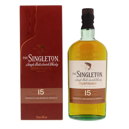 Ruim de helft van de malt whisky-distilleerderijen in Schotland ligt in Speyside en de Dufftown-distilleerderij ligt in het hart van deze vruchtbare regio, omringd door bergen, rivieren en de zee. Dit is een prachtig rijke en volle Speyside Malt, een 15 jaar oude uitdrukking van Singleton van Dufftown. Het rijpingsproces in een combinatie van Europese en Amerikaanse eikenhouten vaten creëert de zachte, zoete, toegankelijke stijl en een pittige, droge afdronk. Iedere slok heeft een ietwat kruidig en droog karakter met toffee, appel en een vleugje honing, in evenwicht gebracht door lijnzaadolie en ziltige aroma's. De zoete kastanje en scherpe smaak van rood fruit maken het een ideale malt. Zonder water is de smaak zoeter in het begin, met een drogere afdronk. Warm, licht en soepel; neigt naar delicaat. Vers fruit met kruidige boventonen. Geruststellend evenwichtig voor een 15 jaar oude whisky. Drink hem puur of met een beetje water.